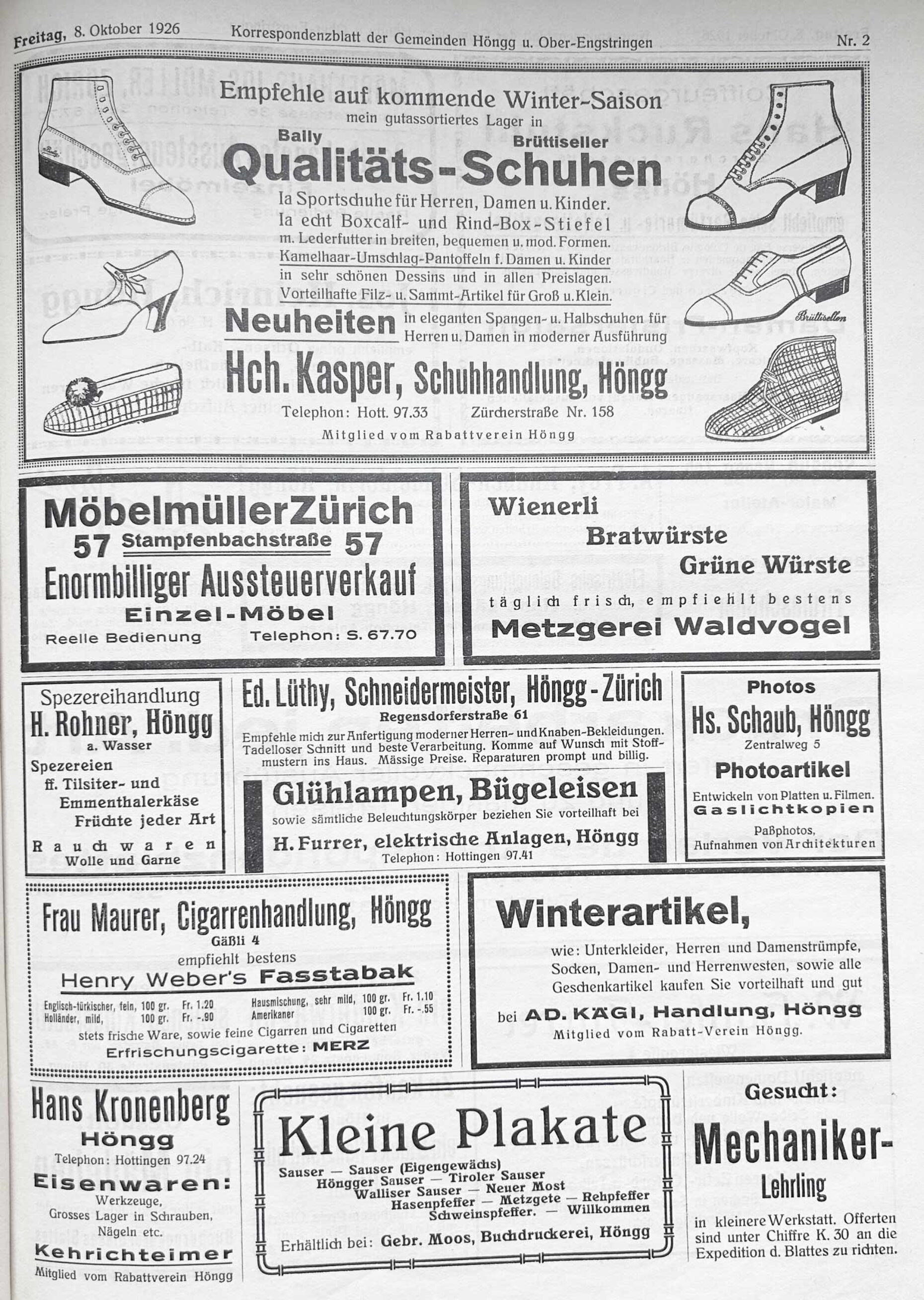Amüsant sind die ersten Inserate: Frau Maurers Cigarrenhandlung im Gässli 4 bot eine Hausmischung an, bei A. Appenzeller an der Regensdorferstrasse 19 gab es «von den einfachsten bis zu den elegantesten Schirmen», das Coiffeur-Geschäft Hans Ruckstuhl an der damaligen Zürcherstrasse 116 empfahl seine Parfümerie- und Toilettenartikel und der Turnverein Höngg lud am 2. Oktober in die «Mühlehalde» zur Abendunterhaltung mit Damenriege ein. Der Turnverein gehört bis heute zu den Inserenten der Zeitung.