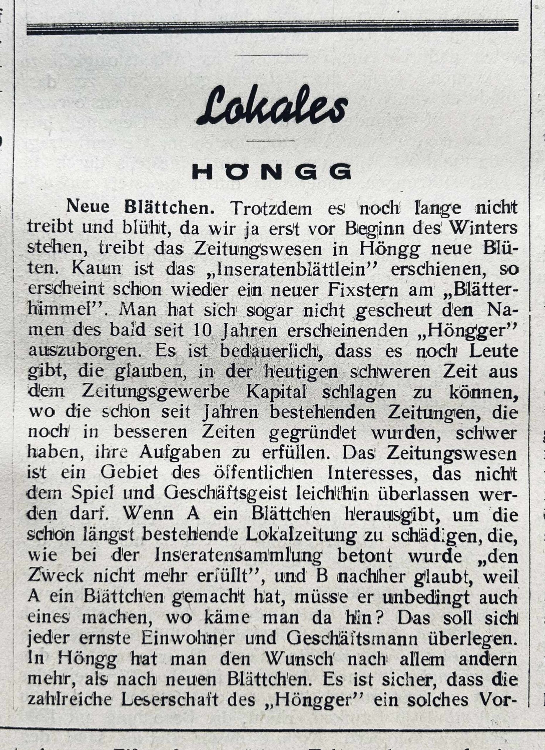 Am Freitag, 1. Oktober 1926, erschien das «Korrespondenzblatt» der Gemeinden Höngg und Oberengstringen. Den Titel «Höngger» trug die Zeitung aber erst sieben Jahre später. Wir blicken zurück auf die erste Dekade, in der die Eingemeindung eine Rolle spielte.