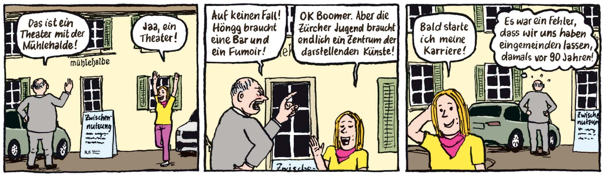 Zwei Comicstrips von Stefan Haller, die im «Höngger» und «Wipkinger» erschienen sind, werden im Maison du Dessin de Presse in Morges gezeigt.